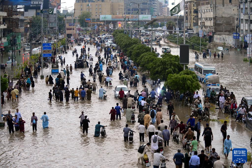 8 -ئاينىڭ 19-كۈنى، پاكىستاننىڭ جەنۇبىدىكى پورت شەھەر كاراچىدا شۇ يەرلىك ئاھالىلەر قارا يامغۇردىن كېيىن سۇ كېچىپ ماڭماقتا.